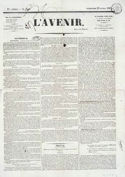 Lamennais gründete die Zeitschrift Avenir, die unter der Devise Dieu et liberaté erschien; in ihr trat er, unterstützt von Lacordaire und Montalembert, für eine Zusammenarbeit von Katholiken und Liberalen ein. Wichtiger als diese politische Wendung, die vor allem taktische Gründe hatte, war jedoch die Tatsache, daß der Avenir als erstes politisches Organ des modernen Katholizismus, die neue Situation der Kirche in der nachrevolutionären Zeit systematisch untersuchte und dabei Verhaltensmaßregeln entwickelte, die für eine ganze Generation des liberalen Katholizismus bestimmend wurden . Mit Recht hat Gurian die Zeitschrift daher als "das bis heute bedeutsamste katholische Presseorgan" bezeichnen können.