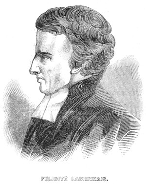 "Was Lamennais mit Pascal verbindet, ist die Leidenschaft, mit der sich ein genuin christlicher Geist der Mittel des zeitgenössischen Denkens bemächtigt, um daraus auch den unbeteiligten, ja areligiösen Gesprächspartner zwingende Waffe zu schmieden - und nicht zuletzt die ausfahrende Heftigkeit, die trotzig-selbstgewisse Haltung gegenüber dem, was er verteidigt..." (Maier)"