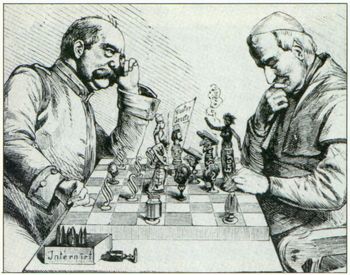 Reichskanzler Bismarck mit Papst Pius - zeitgenössische Karrikatur während des Kirchenkampfes im 19. Jahrhundert