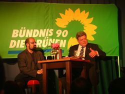 ![]() Der Grünen - Spitzenkandidat für die Europa- Wahl, Reinhard Bütikofer, referierte in Bad Ems. "Der Weg aus der Wirtschaftskrise, den seine Partei als 'Green New Deal' bezeichnet, könne nur gelingen, wenn wirtschaftlicher Fortschritt mit ökologischer Verantwortung einhergehe. Die Energieeffizienz sei die Kernformel für die Konfliktlösungen. Die Förderung ökologischer Innovationen und bereits vorhanderer er- neuer- barer Energien, die immer mehr und zukunfts-fähige Arbeitsplätze schaffen, die die Wirt- schaft, vor allem kleine und mittelständige Unternehmen, stärken und gleichzeitig dem Klimaschutz dienen, sei notwendig (Rhein- | ![]() Lahn-Zeitung, 125, 2. Juni 2009). Foto links mit Josef Winkler, MdB. CDA-Landesvorstandsmitglied Gerhardt regte eine Modifizierung der internationalen Entwicklungs- hilfe an. Auch sah er die Not- wendigkeit, dem Aufkauf von Ackerböden seitens asiatischer Länder in Afrika und der Überfi- schung der afrikanischen Küsten-gewässer durch die europäische Fischfangflotte seitens der EU entgegenzutreten. (F.: M. Gerhardt) |