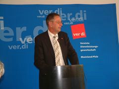 Uwe Klemens, Landesbezirksleiter ver.di Rheinland-Pfalz begrüßte die zahlreich er- schienenen Gewerkschaftler und die Teil- nehmer der Podiumsdiskussion, die von Margarete Ruschmann moderiert wurde. ![]() | Professor Gunnar Schwarting als Vertreter des Städte- und Gemeindetages Rhein-land-Pfalz beeindruckte mit einer fundierten Analyse der Auswirkungen einer Schulden-bremse auf die Investitionsmöglichkeiten der kommunalen Haushalte. (Fotos: mgdt) |