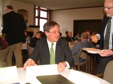 ![]() "Integrationsland NRW - Chancen für Bürgerinnen und Bürger" Als Ansprechpartner für rund 4 Mio. Menschen mit Migrationshintergrund in Nordrhein-Westfalen sprach im azk KönigswinterArmin Laschet, Minister für Generationen, Familie, Frauen und Integration. | ![]() Die Erbsensuppe schmeckt besonders gut, wenn sie durch einen ehemaligen Minister serviert wird. CSP-Stiftungsvorsitzender Werner Schrei- ber (rechts) mit Minister Laschet. Im über- füllten Kaminzimmer berichtete er über die Integrationsanstrengungen in NRW. |